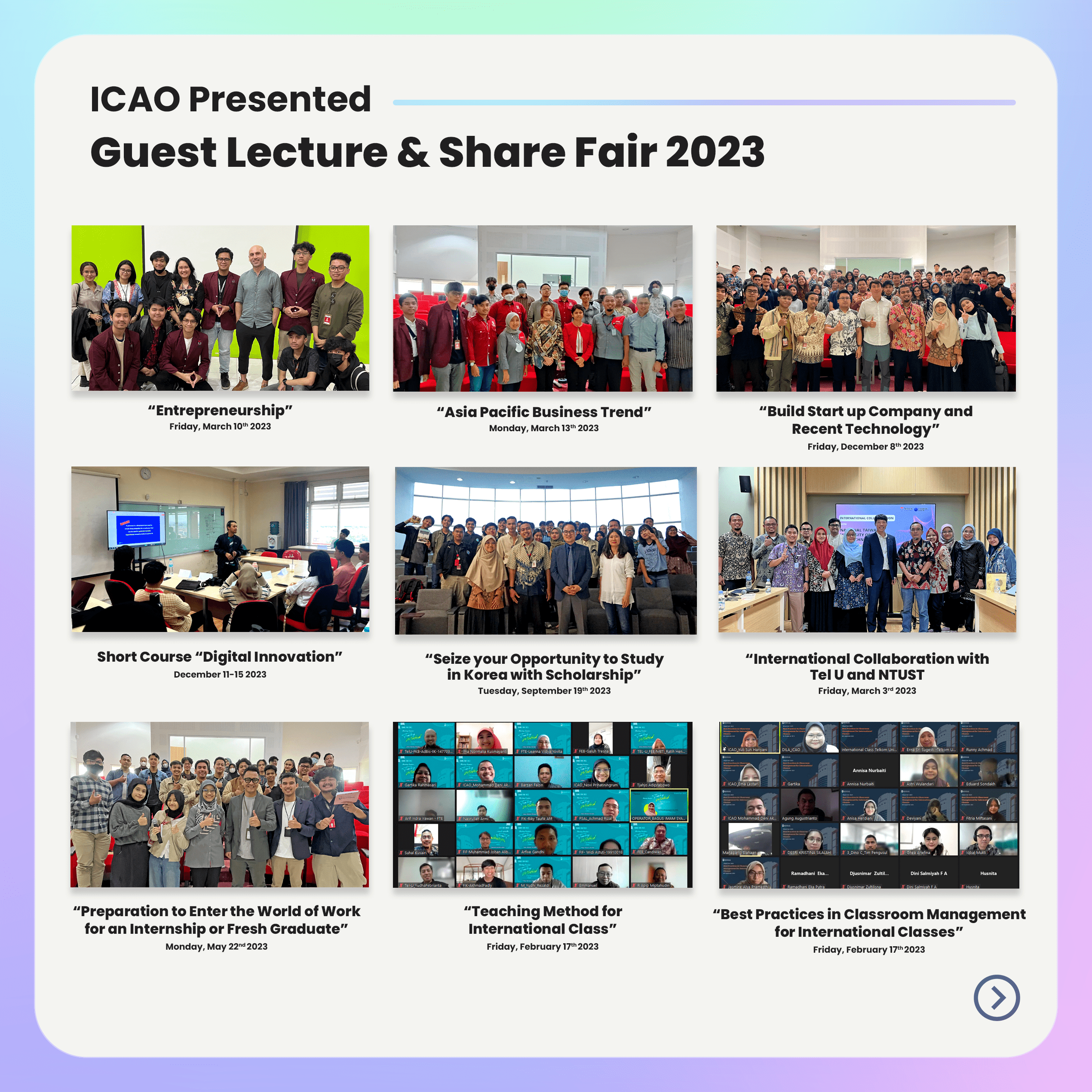 In the past year, the International Class Academic Office (ICAO) orchestrated numerous captivating events, including webinars and enlightening sharing sessions. These sessions covered many inspiring topics, such as student exchange experiences, internship preparedness, and scholarship opportunities. Global Learning Week featured nine distinguished lecturers from various countries, adding a global perspective to our academic endeavors. Additionally, an engaging onsite orientation was organized to welcome new students, along with the Writing from Scratch Center supporting batches 8 through 10 in their Research/Final Projects. The enthusiasm displayed by supervisors and participating students contributed to the program’s success.